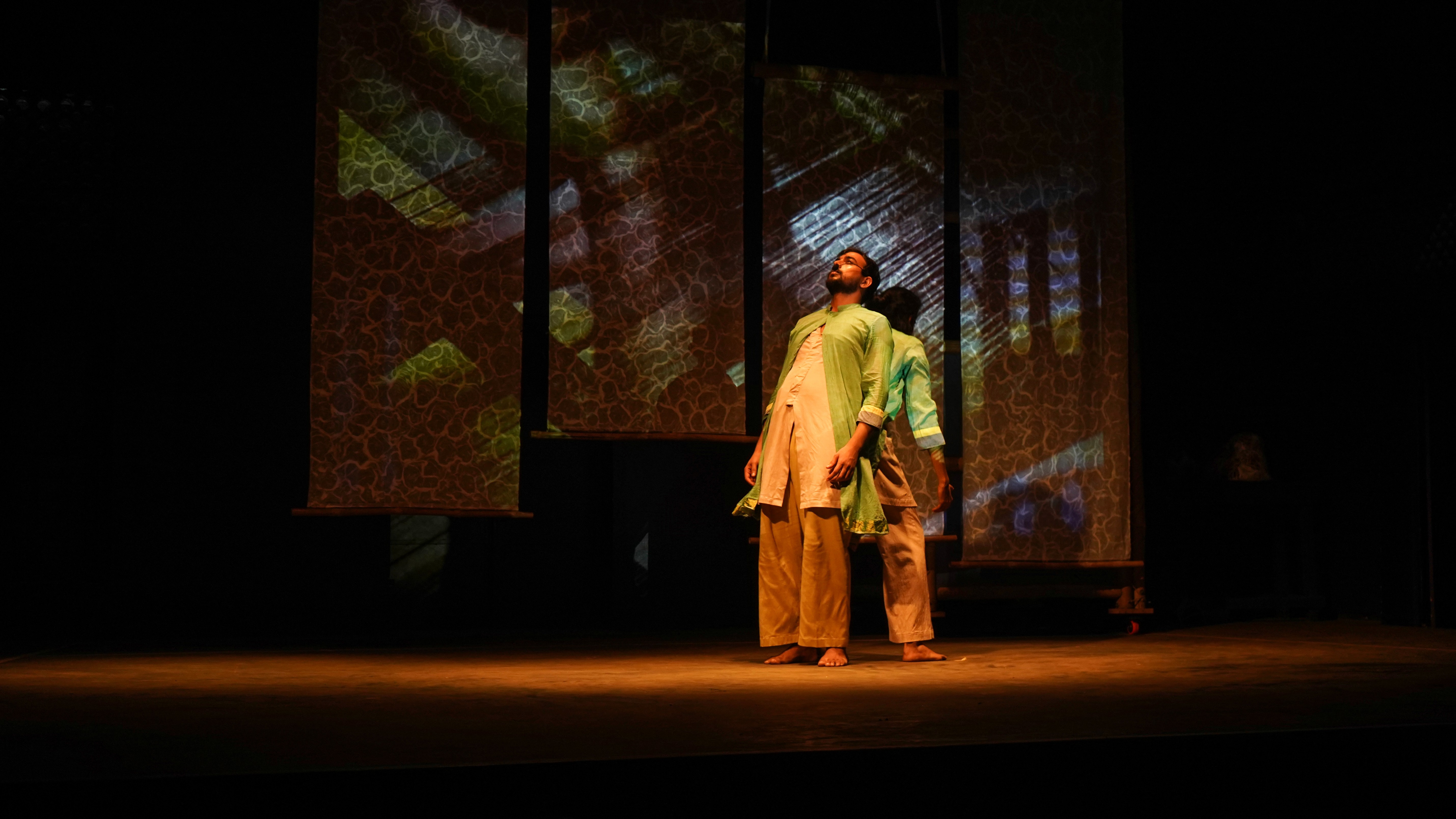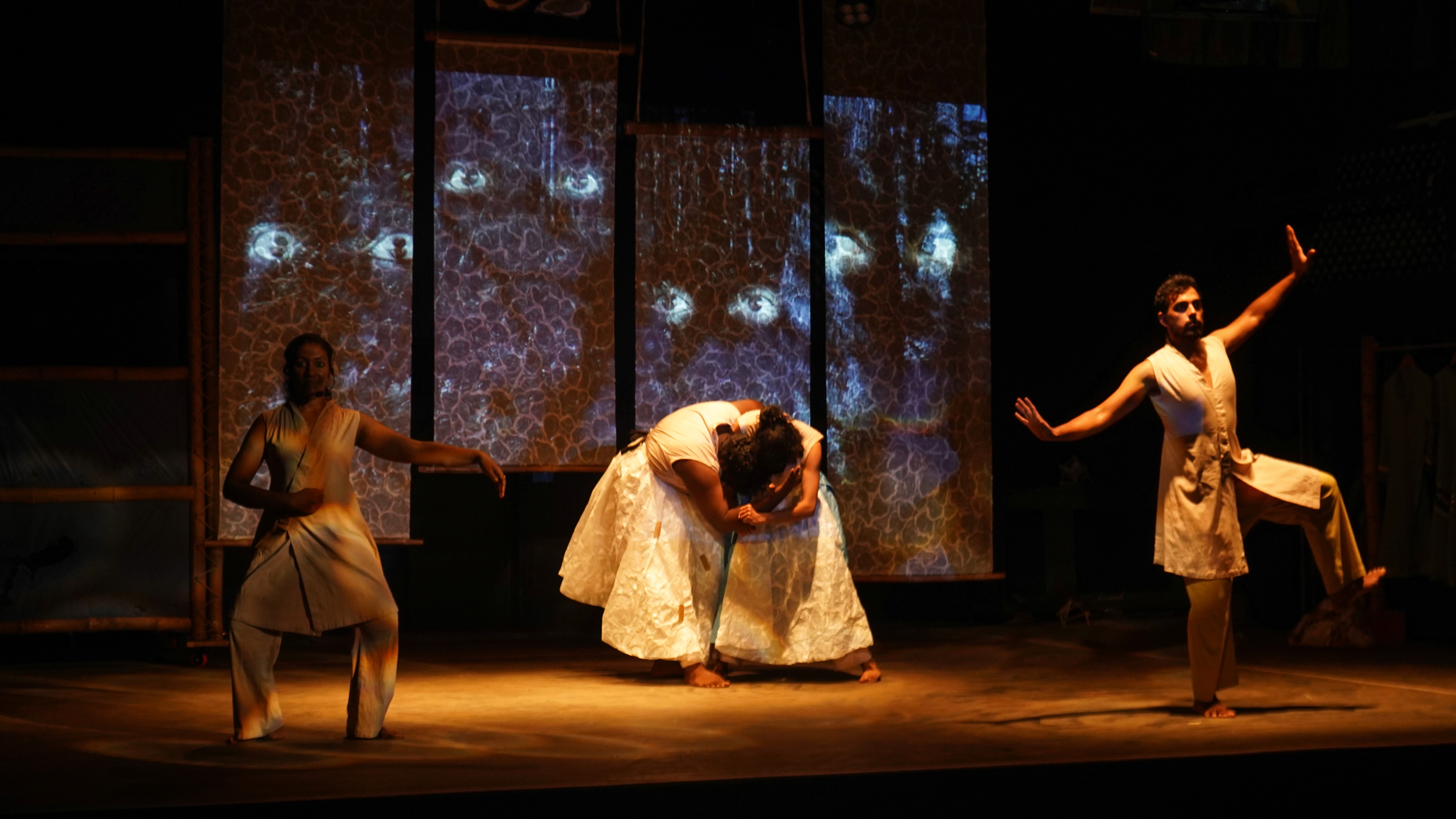 *Image description: Two performers upstage lean against each other before panels of fabric loom film projections.