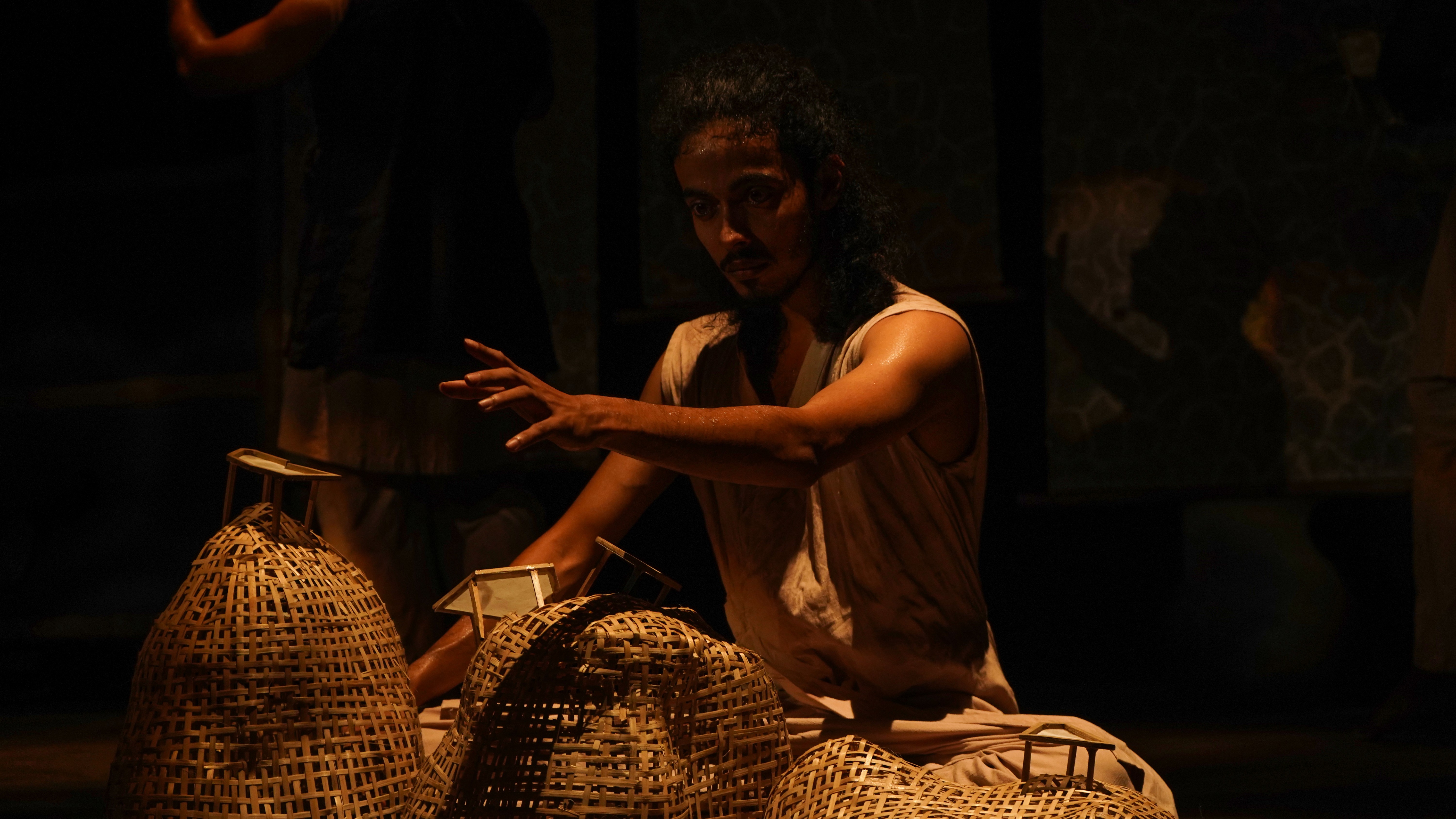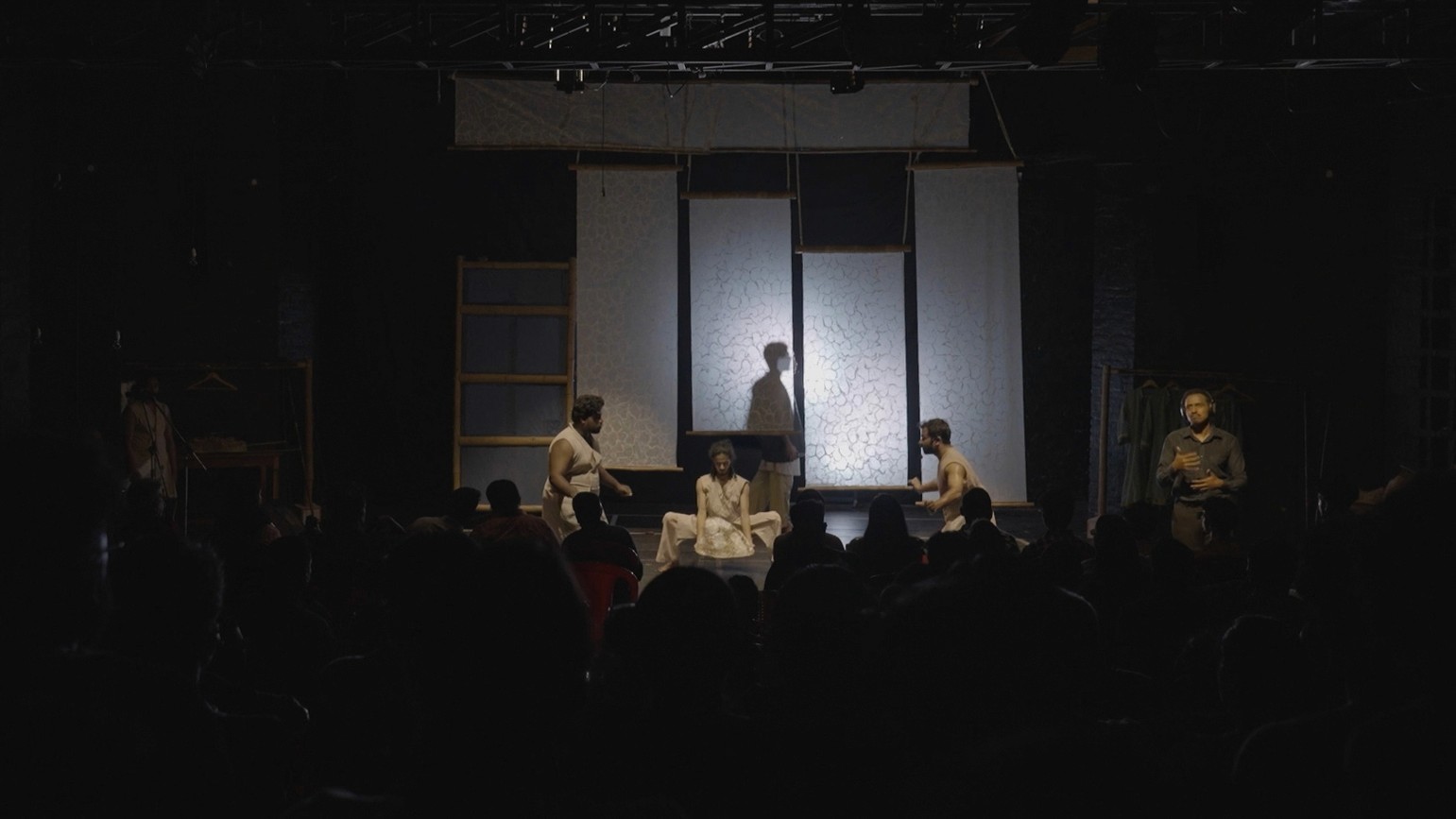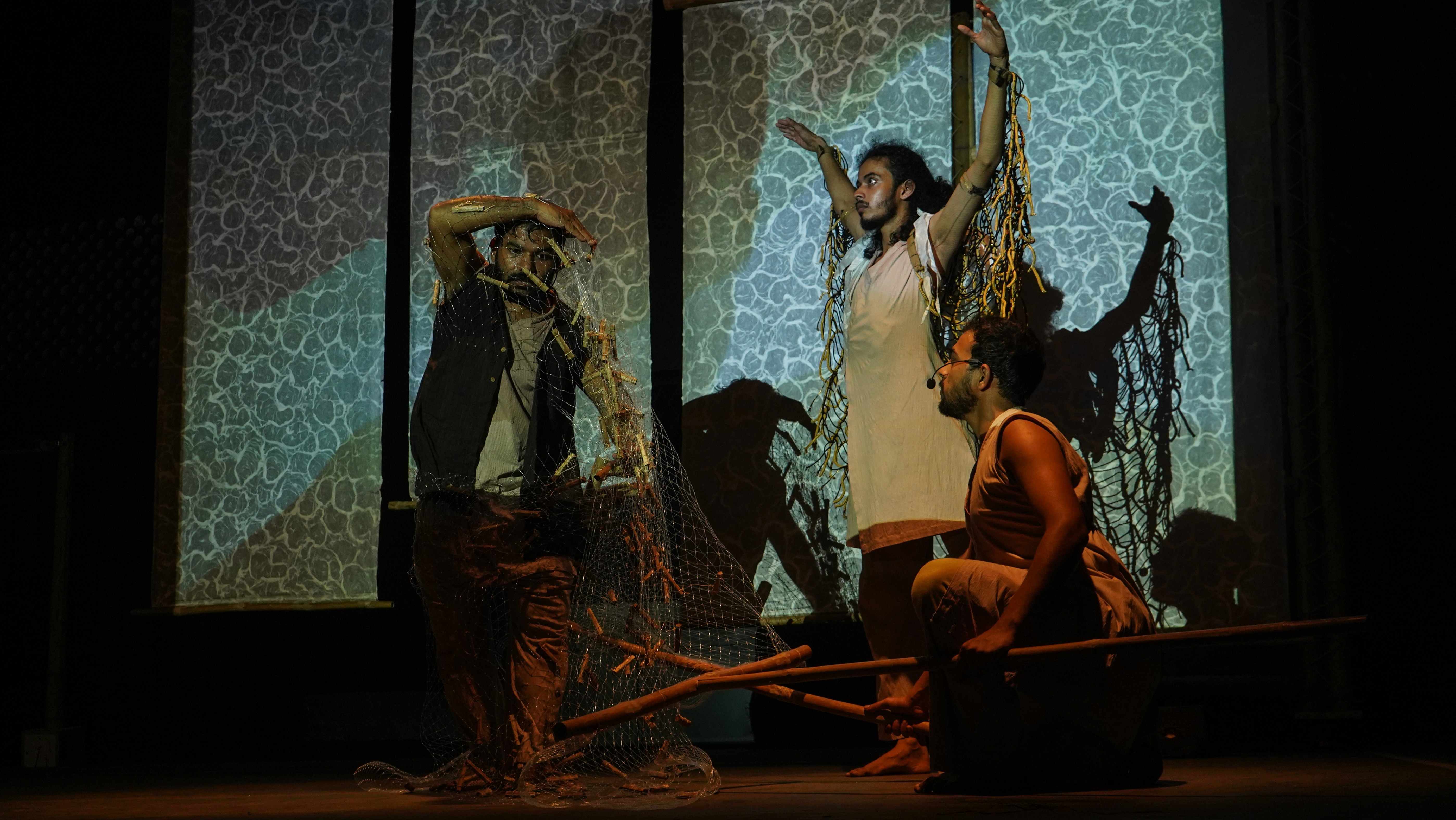 *Image description: 4 performers in plain attire and scattered rocks on stage.