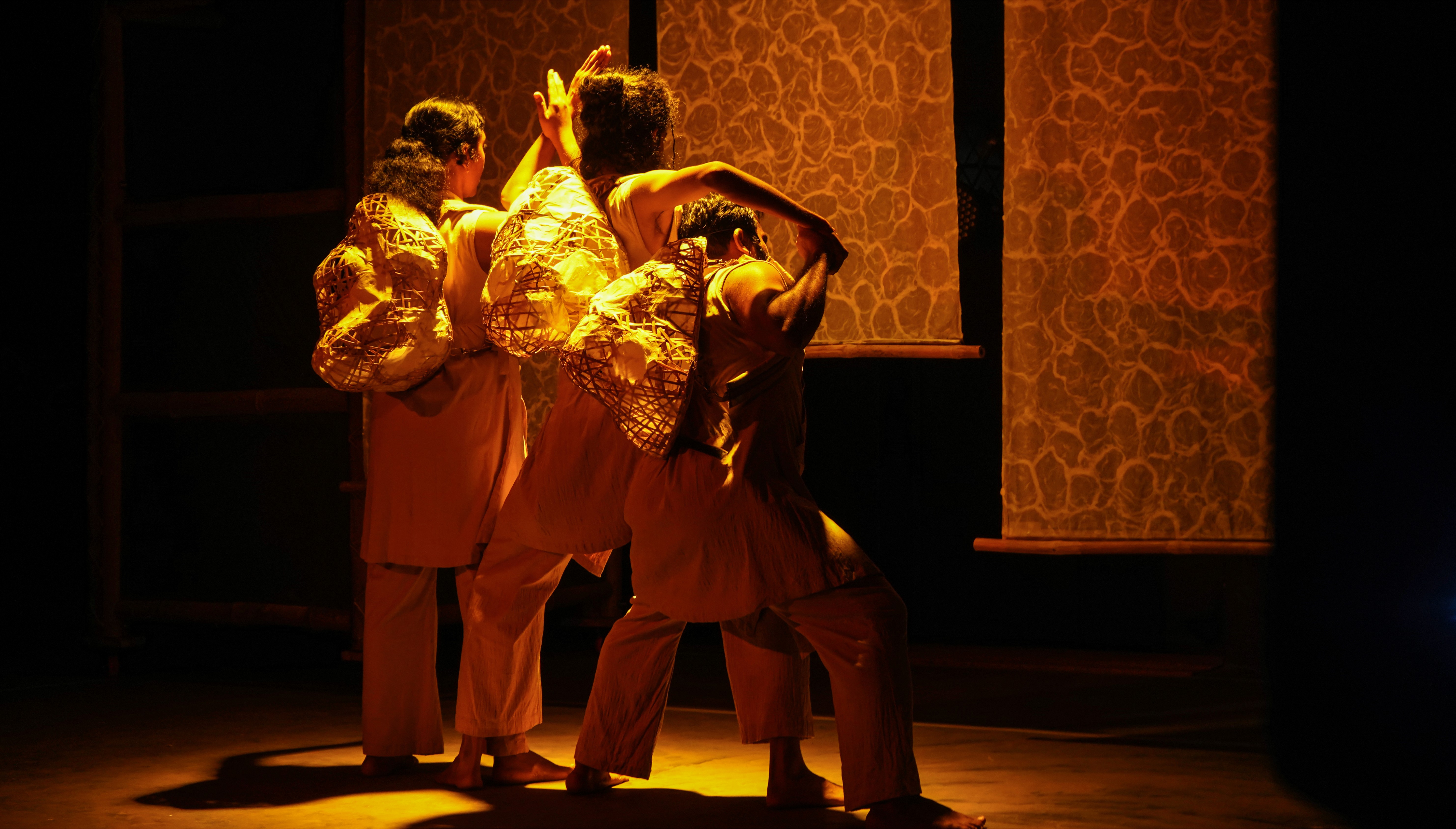 *Image description: Shadow silhouette of three performers against the backlit paper screen.