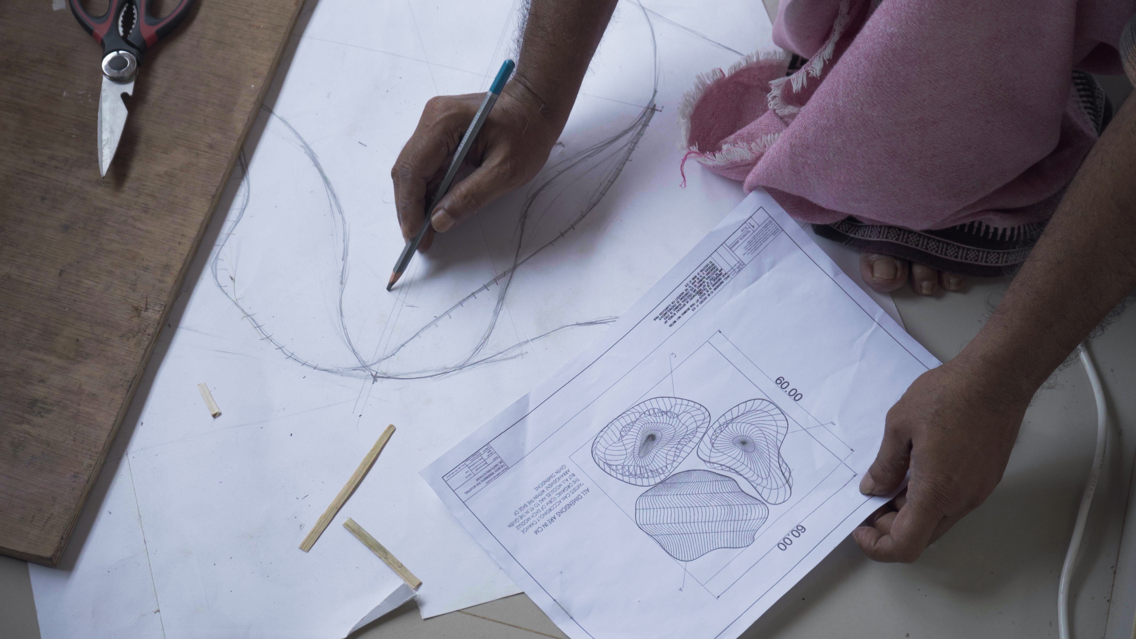 *Image description: An artist traces the drawing for making the bamboo sculpture.