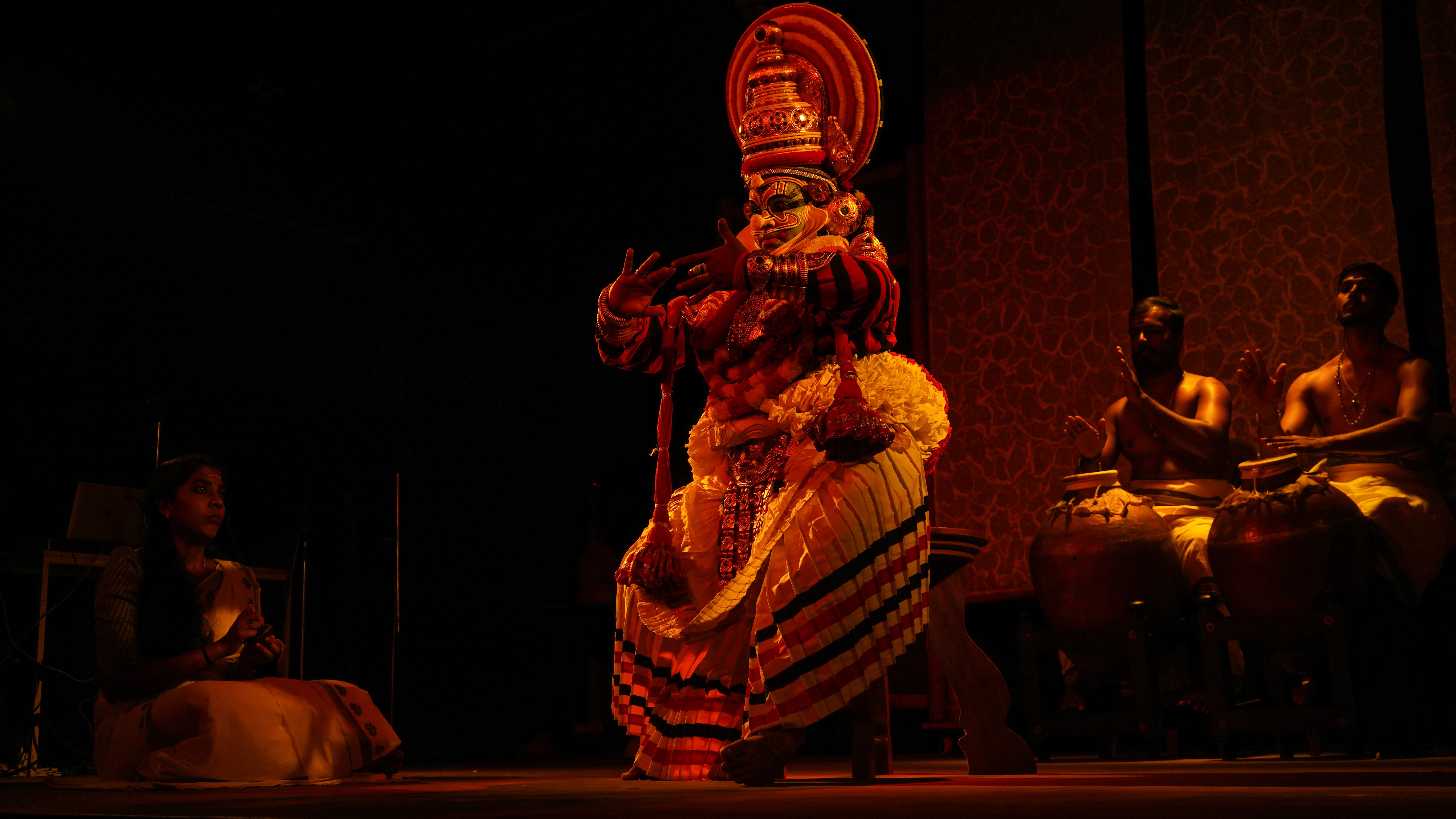 *Image description: Kutiyattam performer center stage, 2 drummers behind, and kuzhithalam player to the right.