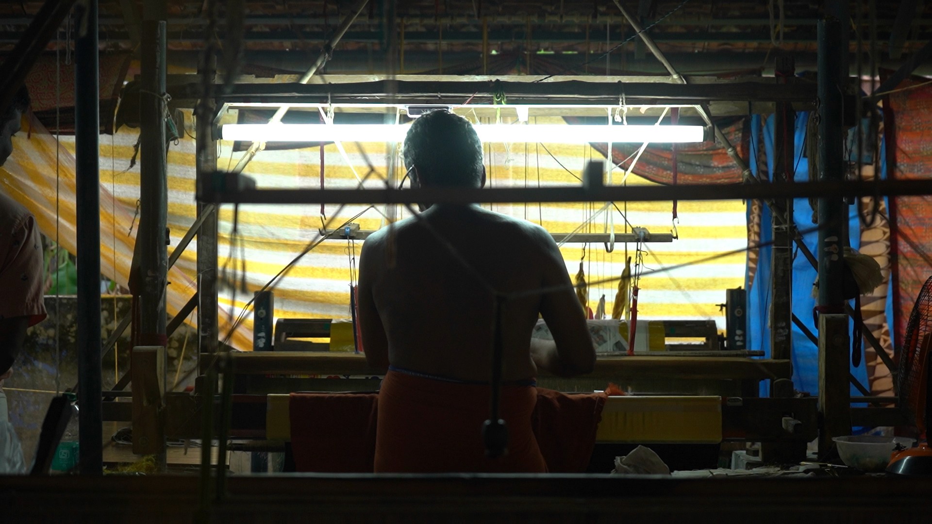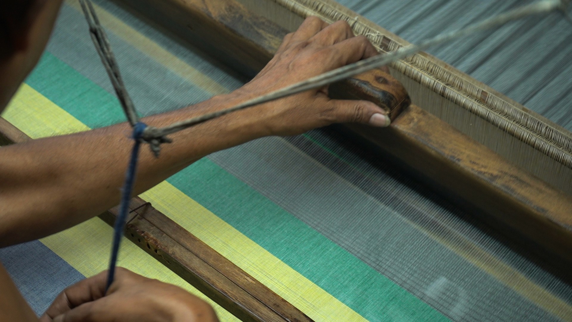 *Image description: Fabric weaving on a loom, weaver's hands in shuttling motion.