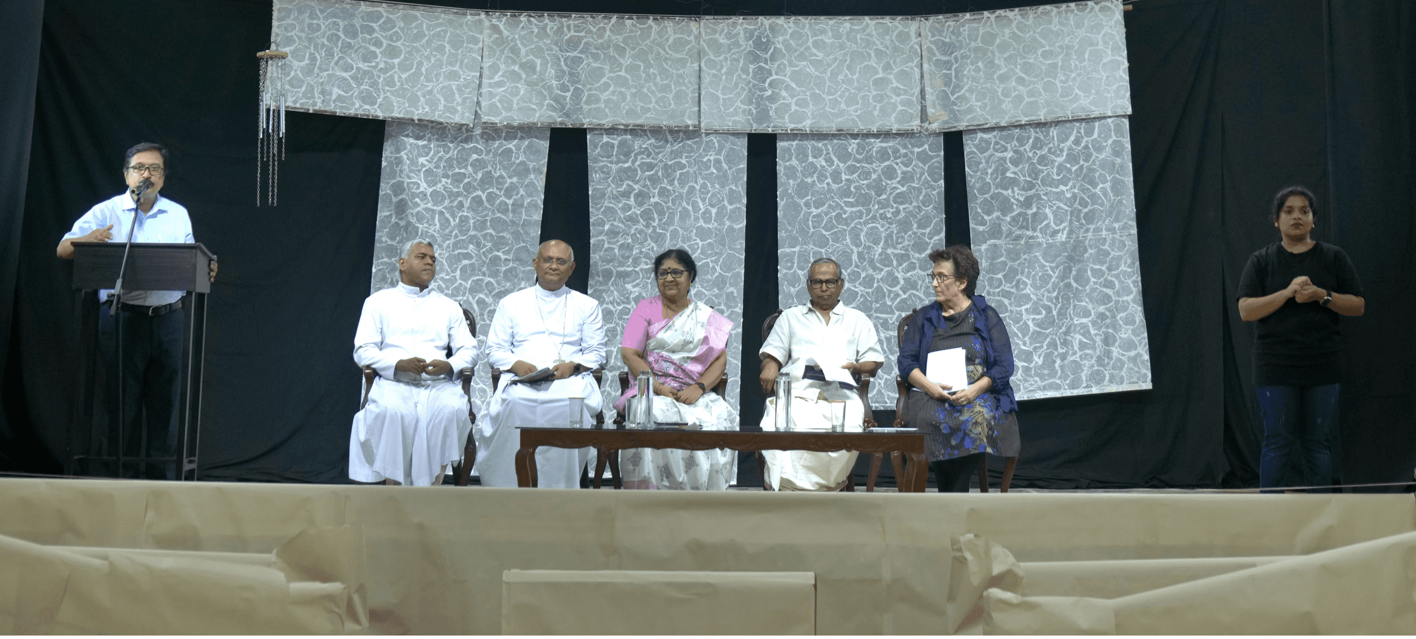 *The image depicts the inaugural function of a Public Presentation at Medlycott Hall. Dr. CS Biju delivers a welcome speech from a podium on the left, while five dignitaries sit centrally: Fr. Martin, Mar Tony Neelankavil, Dr. R Bindu, Kalamandalam Raman Chakyar, and Dr. Kanta Kochhar-Lindgren. To the right, a woman provides sign language interpretation. The stage features a striking artistic design with black curtains, textured white paper panels, and a brown paper-covered foreground.