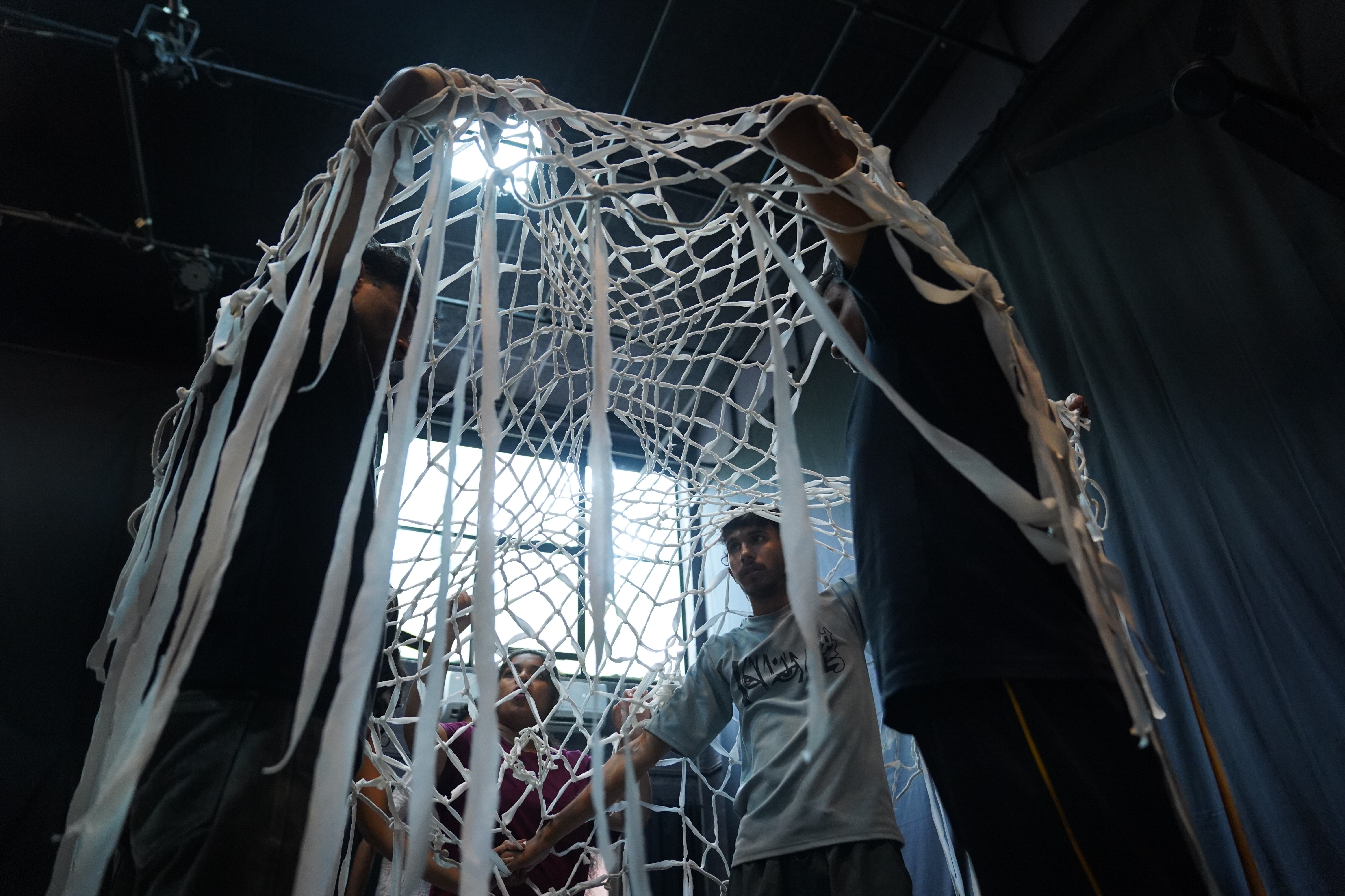 *Participants lift a large, intricate white cargo net toward an overhead light which is a large-scale Spider Web. Its thick knots and hanging fabric strips form a shifting structural shape in the darkness.