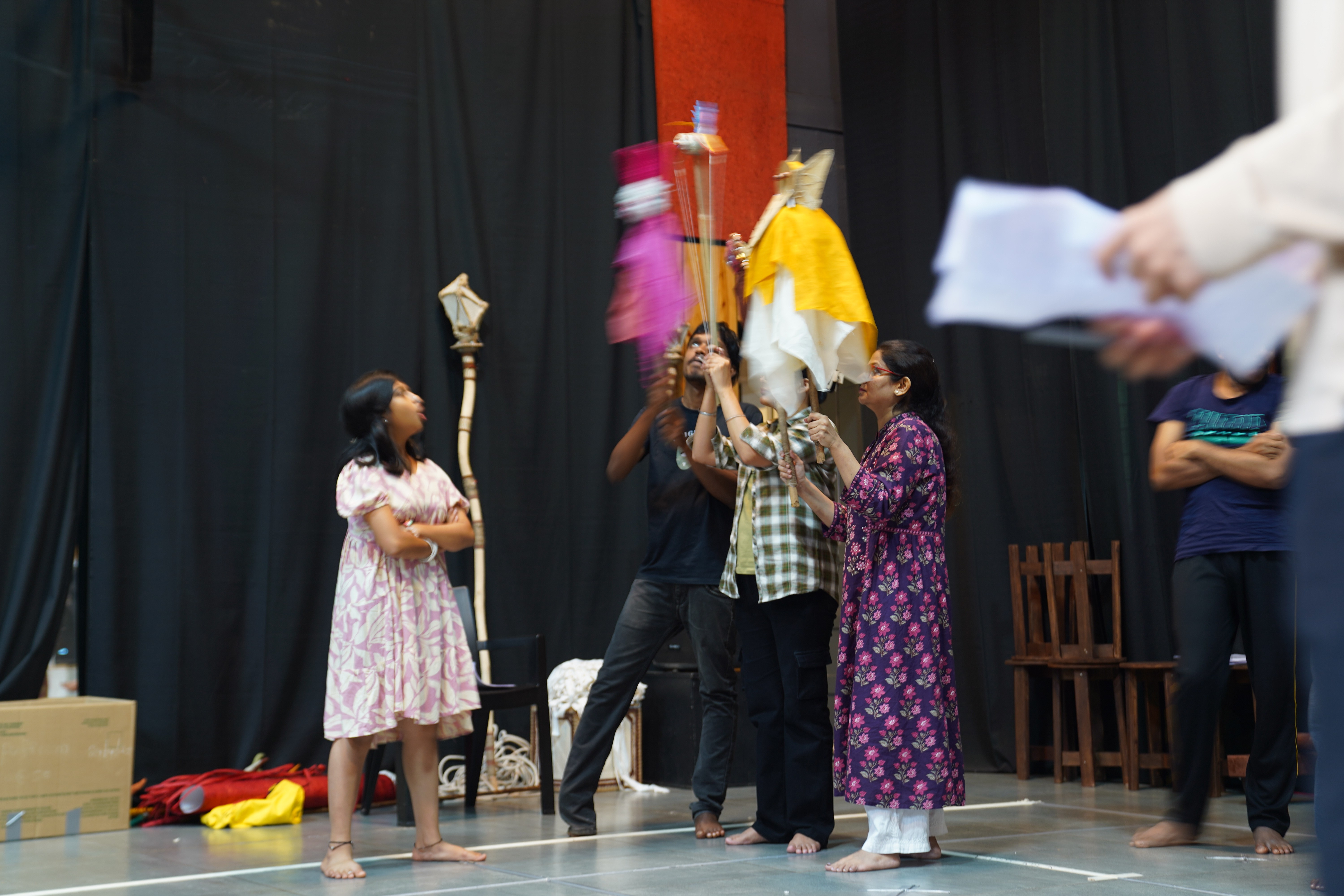 *The participants practice with large, vibrant animal puppets on rods and draped in yellow and magenta cloth. While puppeteers in the center carefully manipulate figures, others observe with scripts in hand.